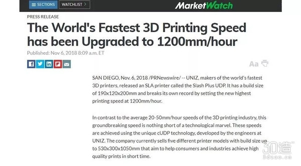 據多家外媒報道,美國東部時間2018年11月6日,早上 8:09 ,全球最快3D打印速度再次被UNIZ科技改寫!UNIZ科技的桌面級3D打印機在cUDP(連續單向剝離)超高速模式下,實現了1200mm/Hour驚人打印速度。而同行業的其他3D打印機平均打印速度在20-50mm/hour。